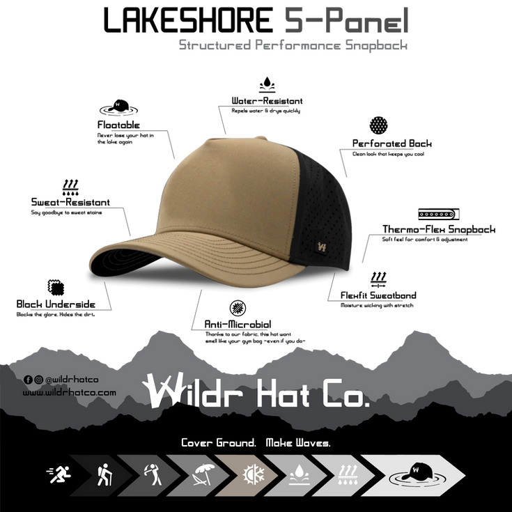 The Lakeshore 5 Panel Two-Tone takes Wildr’s original 5-panel design and adds a bold twist with clean color blocking. Solid front panels, a contrasting brim, and sharp lines give this hat its standout look—while Wildr performance keeps it adventure-ready. Water-resistant, sweat-resistant, anti-microbial, and floatable, it’s the hat that turns two colors into one capable style.